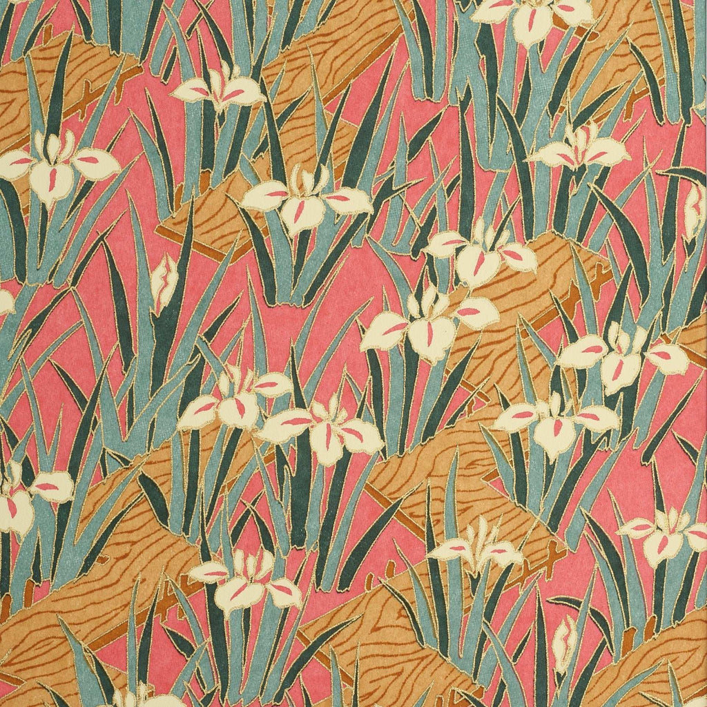 This blank page notebook has a beautiful floral display of white and pink water iris with contrasting viridian and cobalt green foliage layered over a statement backdrop of carmine pink
