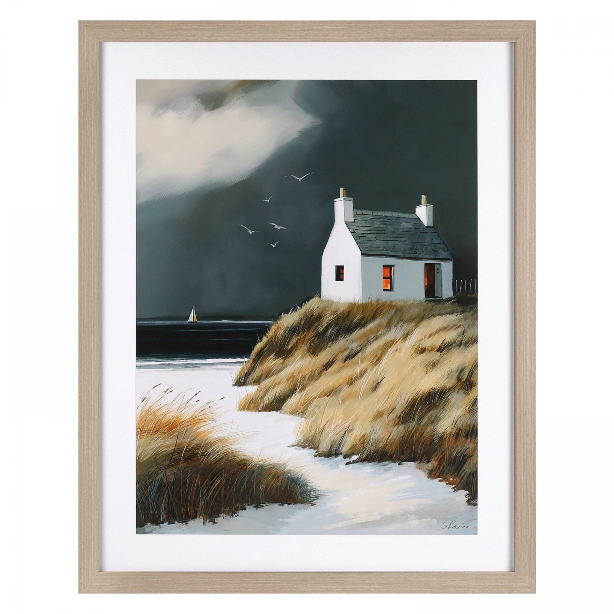 In this framed art print, an isolated chalk-white cottage sits peacefully among the grassy dunes. With warm light from the windows creating a sense of inviting comfort across the remote coastal scene.