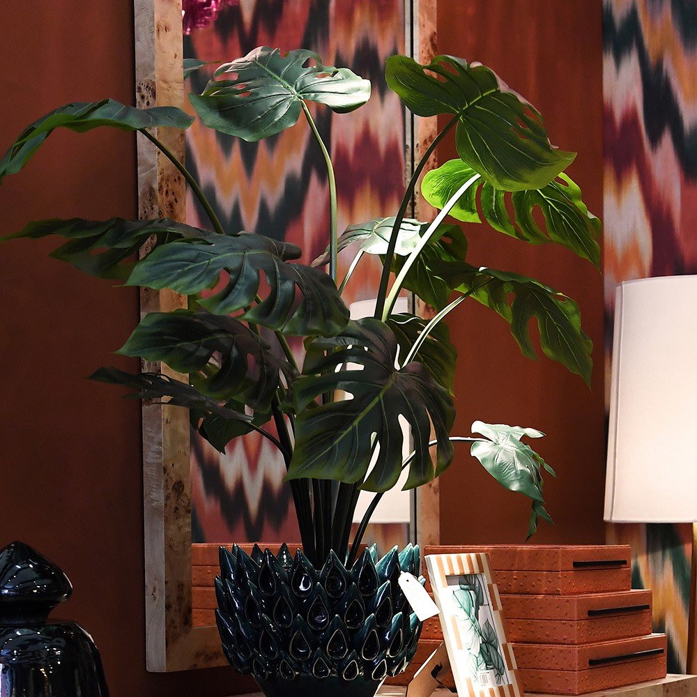 A large super realistic faux Monstera, or Swiss Cheese tree, with vivid green leaves and brown trunk. Supplied in a small black plastic pot. With authentic Swiss Cheese style leaf patterning and variegated colouring.