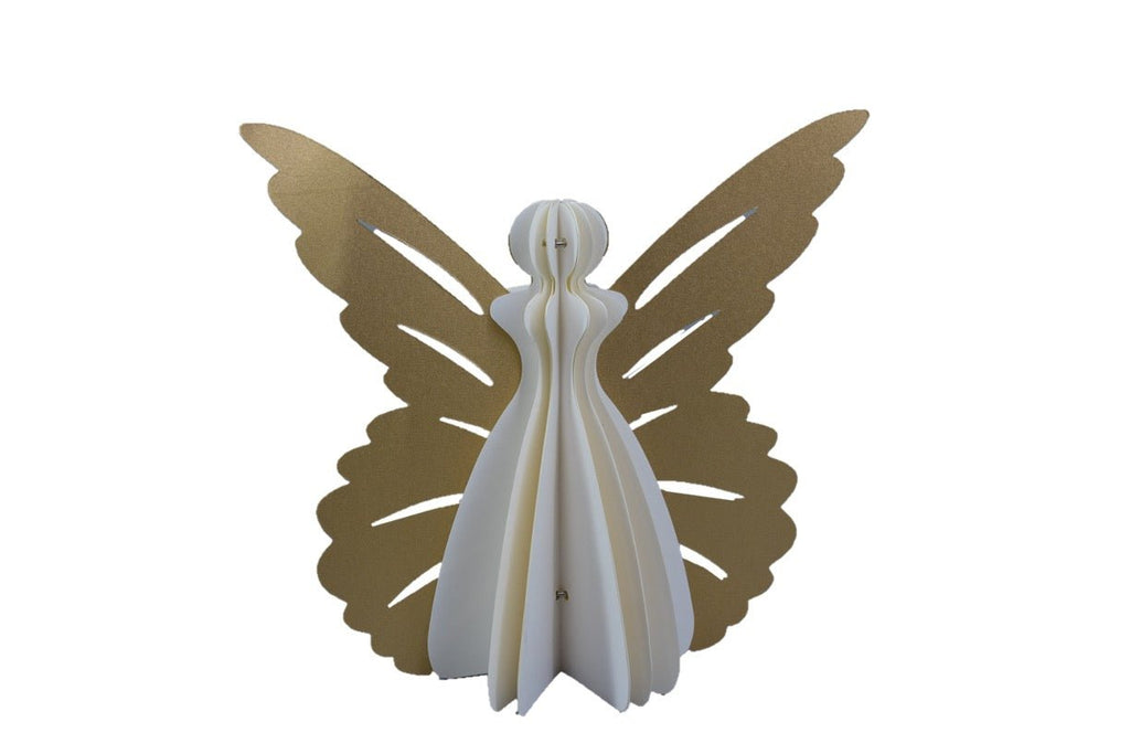 A large paper angel decoration in white and gold, this natural angel decoration is a design classic with large gold wings and a honeycomb paper body design.