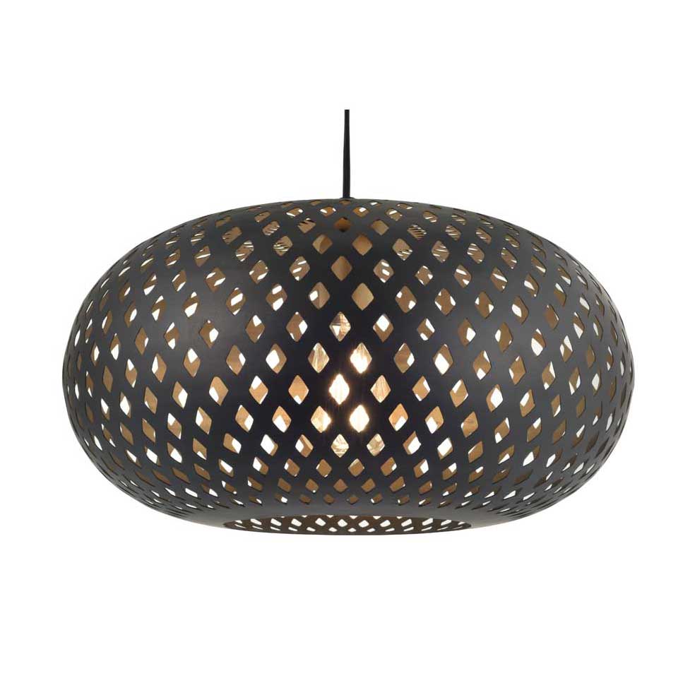 The Makti Quilt Pendant is designed as the perfect companions to our Makti Quilt Lamps. This pendant is a stunning combination of elements, combining a shimmering gold interior with a matte black exterior. The beautiful ellipsoid shape, adorned with cutaway patterns, adds a touch of elegance to any space.