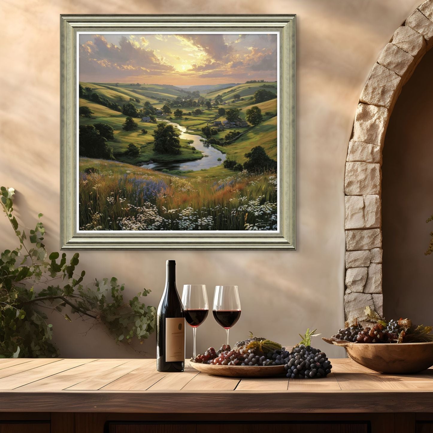 The Meander framed print features an exquisite antique-style gold frame that adds a touch of elegance to any space. This artwork captures a serene landscape, showcasing rolling hills and a tranquil river, illuminated by a warm sunset. The frame is crafted from high-quality materials, ensuring durability while enhancing the print's timeless appeal. Measuring 92cm square, it is designed to seamlessly integrate into both contemporary and classic interiors. The combination of intricate detailing in the frame and the rich colours of the print exemplifies expert craftsmanship. Ideal for living rooms, studies, or hallways, this piece not only serves as a stunning focal point but also enriches your home with its curated beauty.