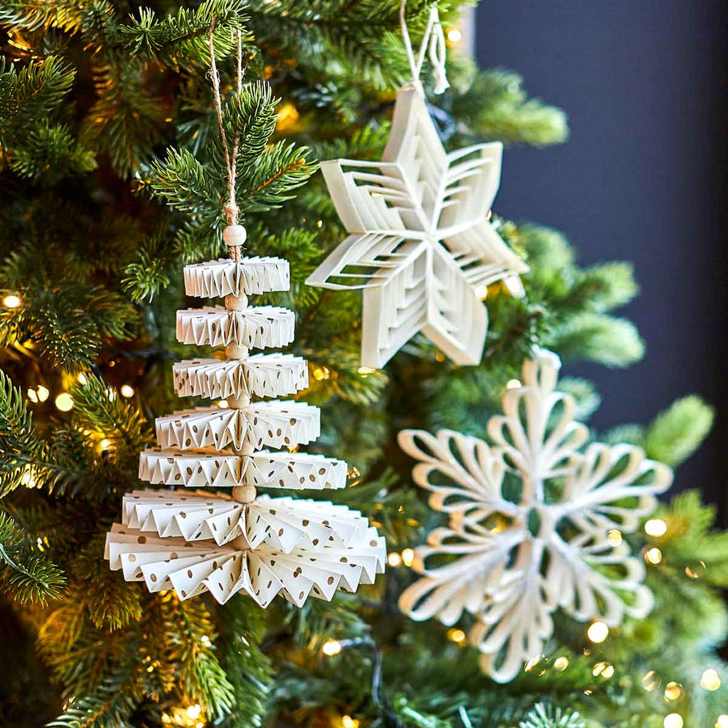 A white paper honeycomb tree decoration with gold spots. This gold and white spotty tree decoration is a fabulous natural looking Christmas decoration. Made from 100% biodegradable materials.