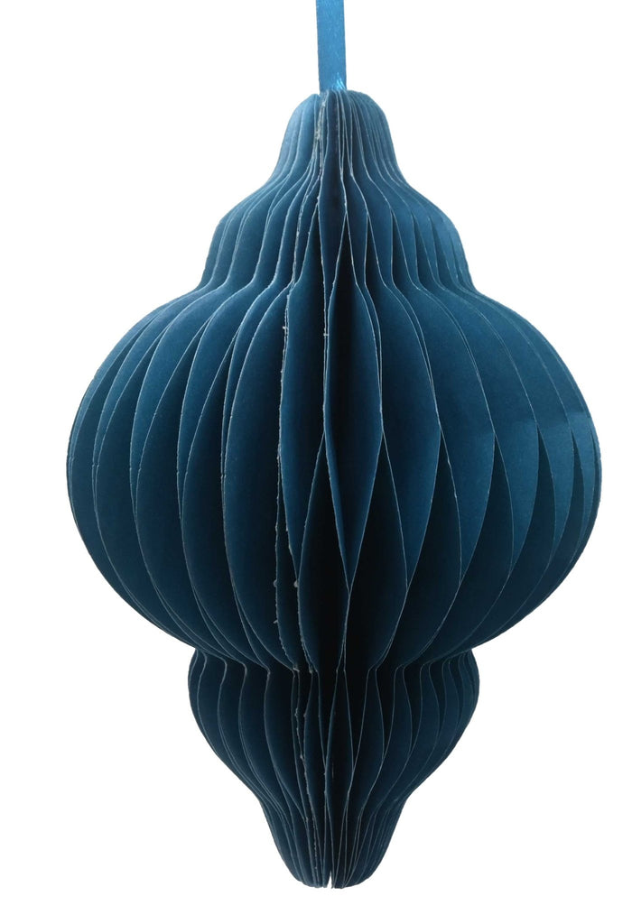 A 20cm Turquoise Finial shaped bauble 20cm in length. This Turquoise honeycomb bauble has a complementary ribbon and is available in several shades this Christmas.