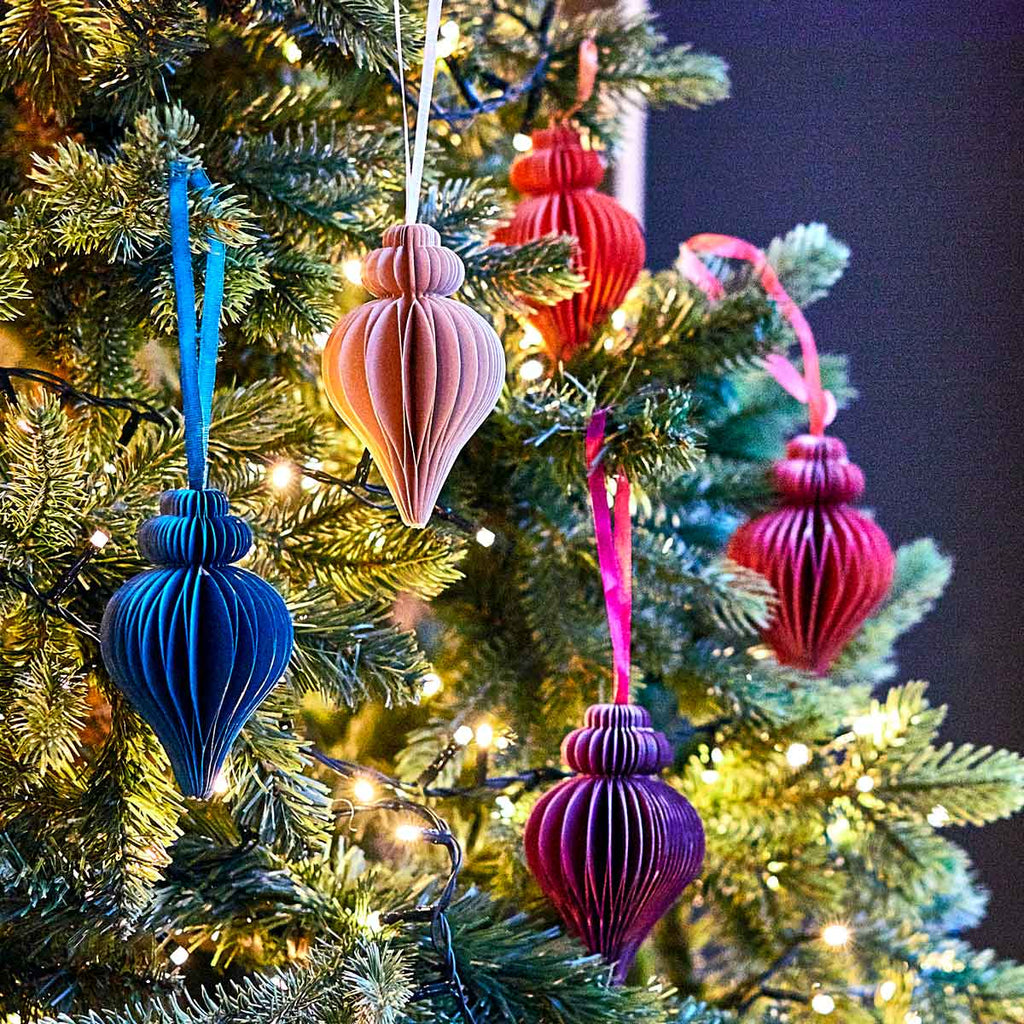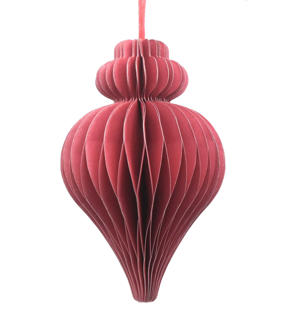 A small Pink Teardrop Finial shaped bauble 10cm in length. This Pink honeycomb bauble has a complementary ribbon and is available in several shades this Christmas.