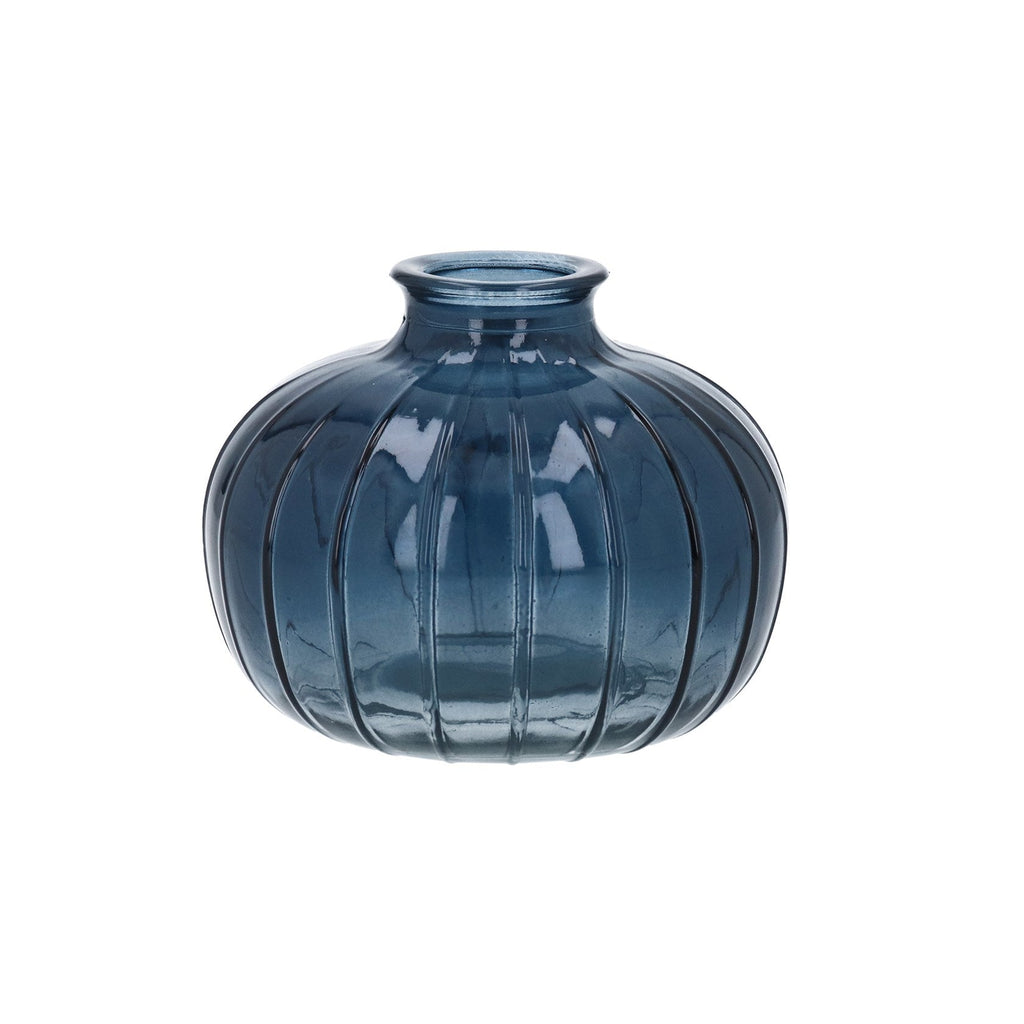 A small squat ribbed style glass vase in a choice of two colours, these shallow glass vases are perfect for a single stem or small group. In muted deep glass colours, Emerald Green or Navy.