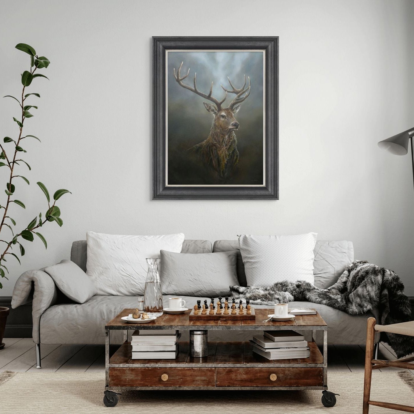 The Royal Stag artwork print beautifully captures the majesty of nature with its striking depiction of a stag, rendered in rich, earthy tones. Set in a sophisticated charcoal frame, this piece exudes a contemporary elegance that enhances any living space. The high-quality print showcases meticulous craftsmanship, ensuring longevity and vibrancy over time. The intricate details of the stag's antlers and fur are complemented by a soft, moody background, creating a serene focal point for your home. Ideal for both modern and traditional interiors, the Royal Stag adds a touch of natural beauty and sophistication while being easy to hang and maintain.