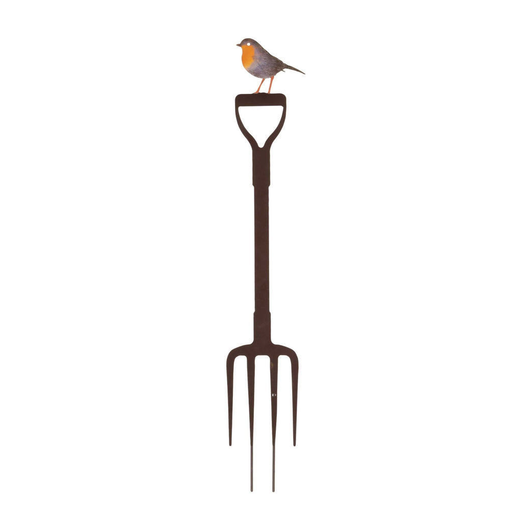 A metal Robin perched atop an imitation fork. Perfect to display in an indoor house plant.