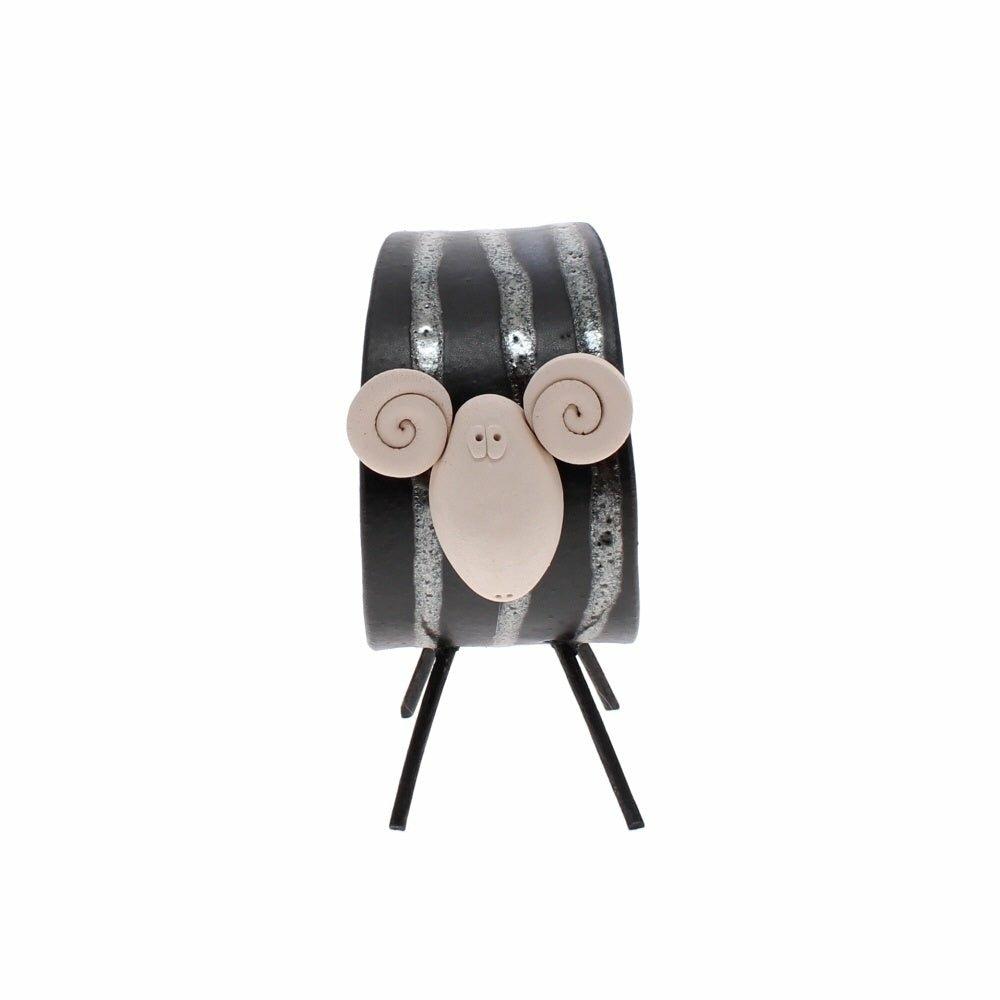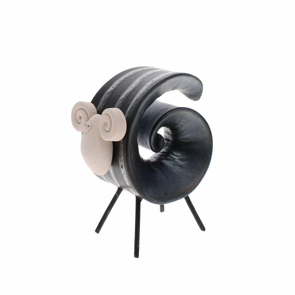 A beautifully handcrafted ceramic ram using a scroll to form the body of the sculpture. Finished in a delicate black glaze that has a slight pearlised effect and three metallic pewter coloured stripes. His face and horns have been left unglazed to create a pleasing effect.