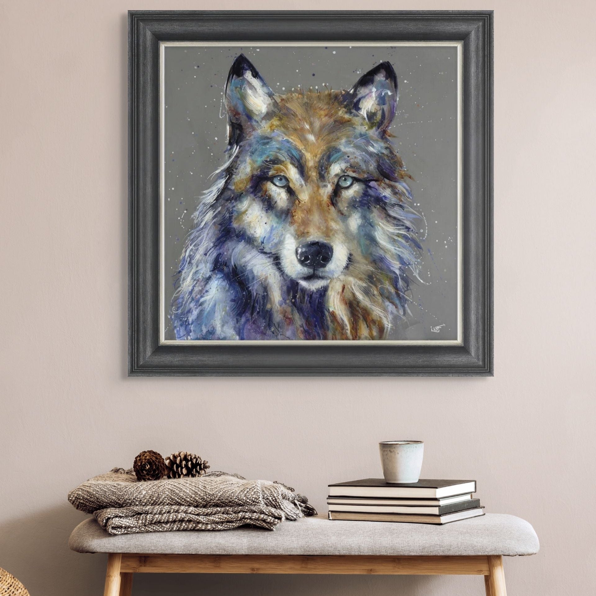 The Shadow art print showcases a striking wolf portrait, beautifully framed in a wood effect charcoal frame that adds depth and sophistication to any space. The print features a captivating blend of colours, with rich browns and subtle blues that highlight the wolf's piercing eyes and expressive fur, creating a sense of connection with nature. Measuring 96cm square, this piece is ideal for making a statement in a living room or bedroom. Crafted with attention to detail, this art print is not only a visual centrepiece but also a testament to quality craftsmanship. The durable frame ensures longevity, while the contemporary design complements various interior styles, making it a perfect addition to your curated space.