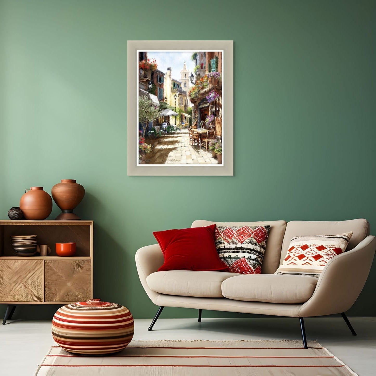 The Side Street Cafe artwork captures the essence of a charming urban setting with its sand-coloured frame providing a warm, neutral backdrop. The image depicts a lively cafe scene, highlighted by vibrant flowers and lush greenery that frame the cobbled street. The use of soft, natural tones in the architecture creates a timeless appeal, while the meticulous details showcase quality craftsmanship. Ideal for enhancing contemporary interiors, this piece can effortlessly blend into various decor styles. Easy to care for, it requires simple dusting to maintain its visual integrity. The dimensions are perfect for feature walls or as part of a curated gallery display, making it a versatile addition to your home.