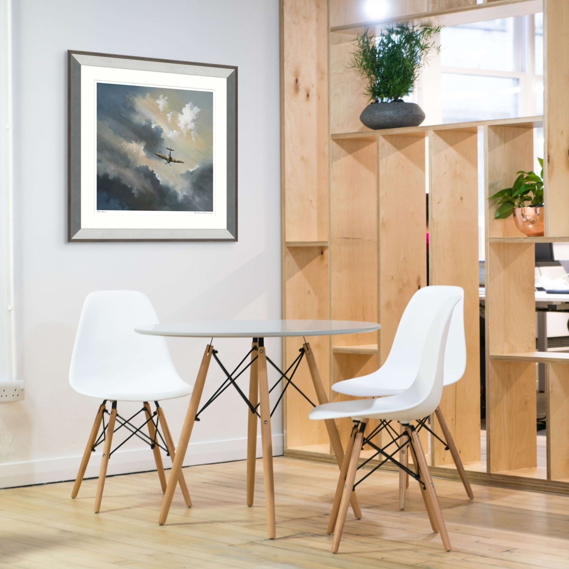 The Spitfire painting captures the essence of vintage aviation with a striking portrayal of an iconic airplane soaring through a dramatic sky. The rich, textured clouds are rendered in a palette of deep blues and soft whites, creating a vivid contrast that enhances the airplane's detailed craftsmanship. Housed in a silver wood effect modern frame, this artwork features a crisp white mount that complements the overall aesthetic. Ideal for adding a sophisticated focal point to any contemporary space, the Spitfire not only showcases quality artistry but also brings a sense of adventure and history into your home. This piece is perfect for enthusiasts of aviation and timeless design alike, making it a thoughtful addition to your curated collection.