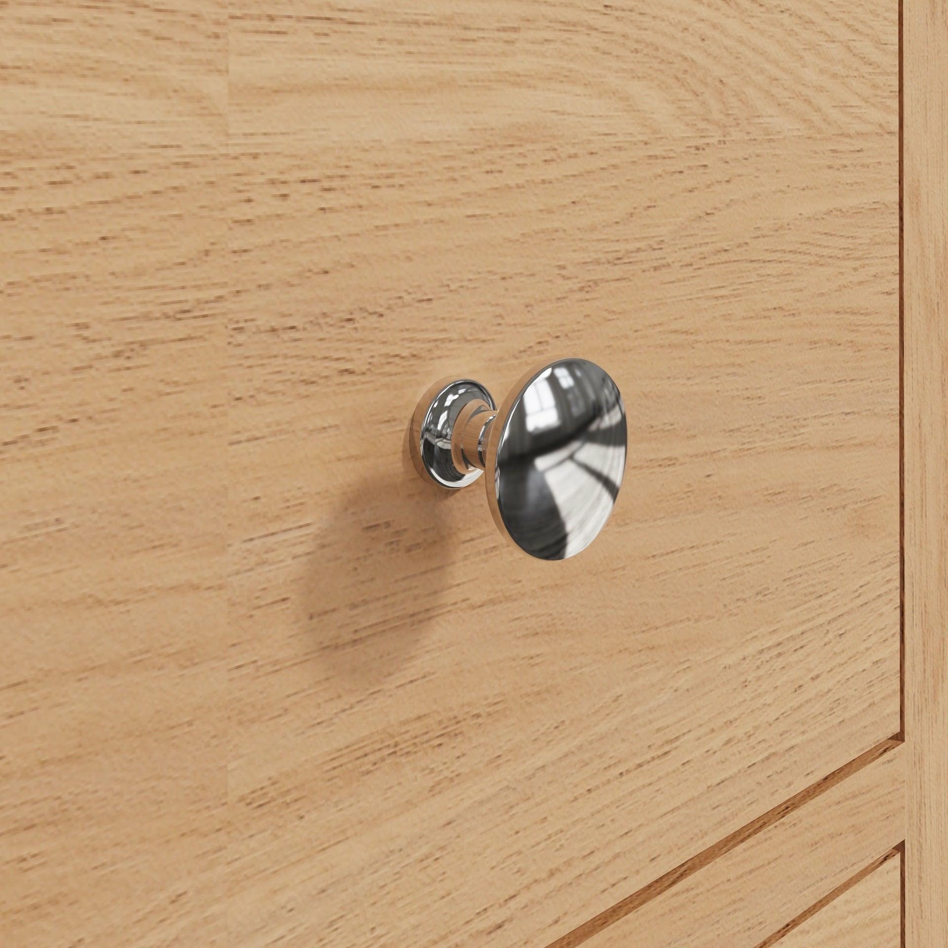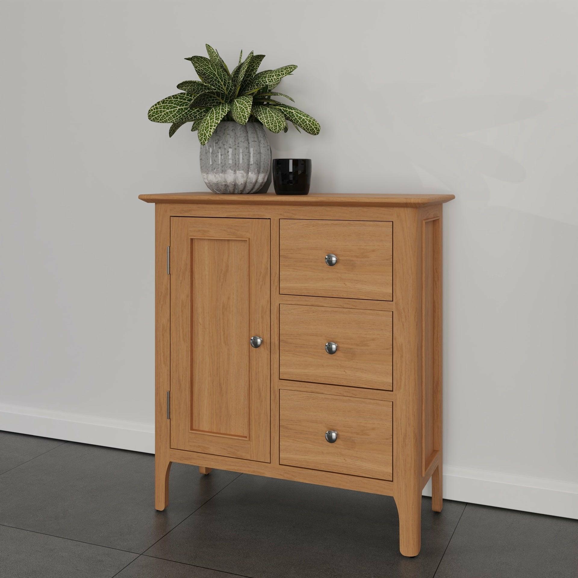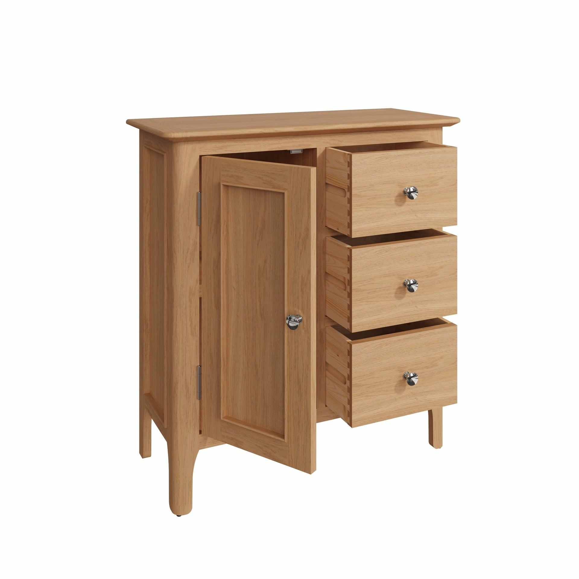 Crafted from oak with oak veneer, this collection features smooth, rounded corners and offers a choice of wood or metal handles.