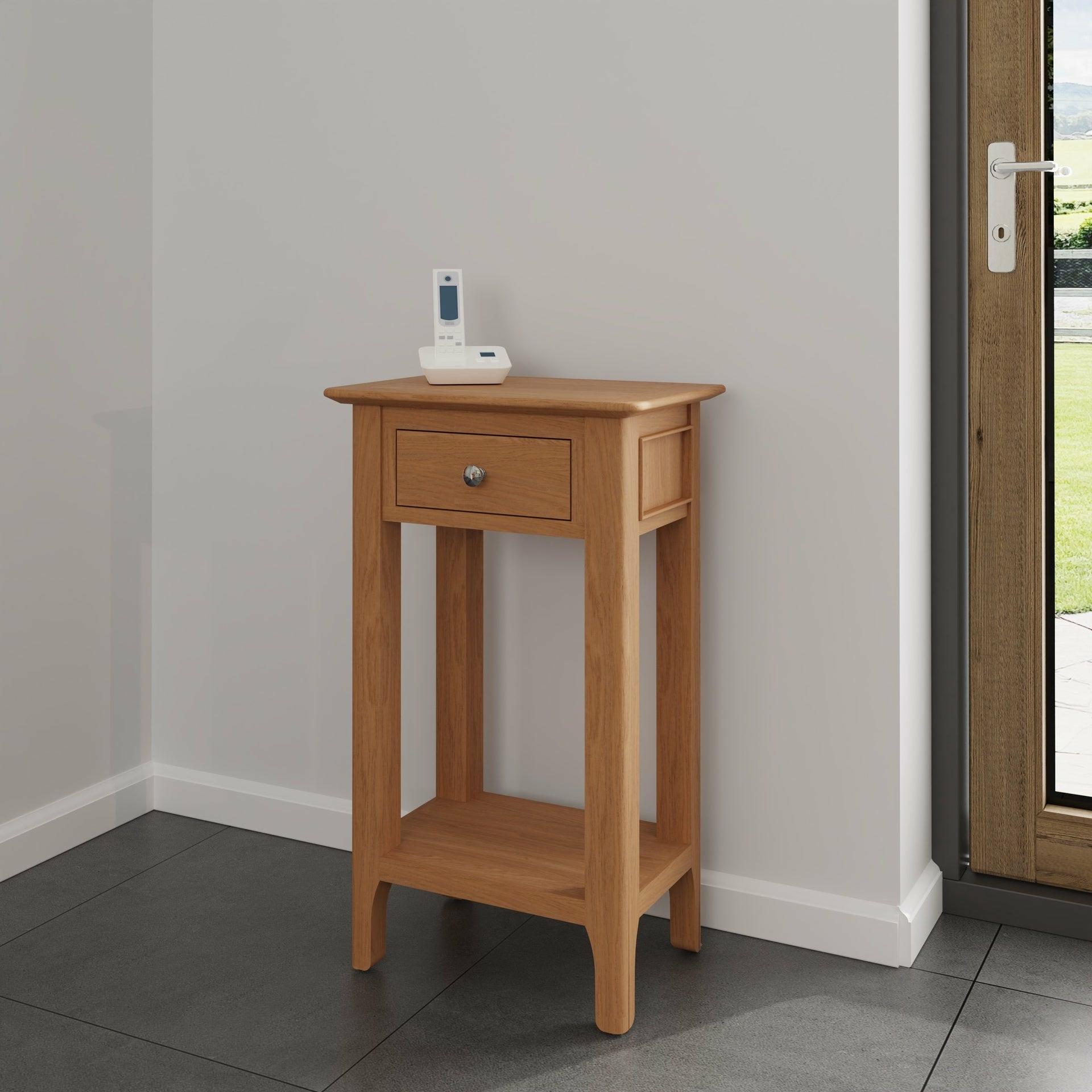 Designed as a phone table with a single drawer we have found that this oak table is an ideal height to display a vase of flowers if you are no longer a household with a landline.