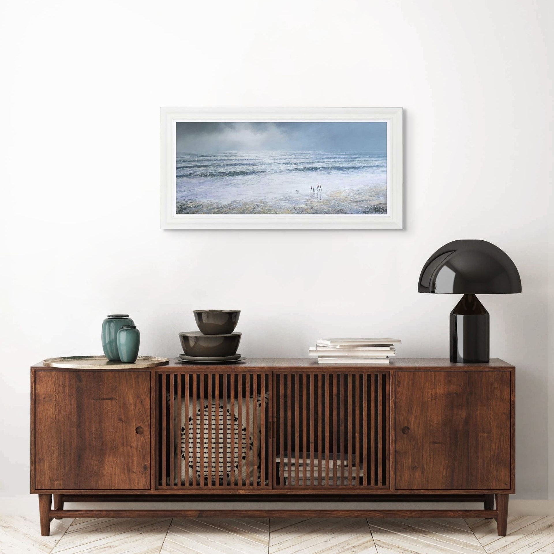 Introducing 'Stormy Seas', a captivating framed artwork that brings the beauty of coastal landscapes into your home. Hand-finished with a textured gel and enhanced by a chrome glitter wash, this piece captures the dynamic interplay of light and water. The subtle hues of blues and whites evoke a sense of tranquility, while the striking texture adds depth and interest. Ideal for contemporary interiors, the artwork is framed in a sleek white border that complements its coastal theme. Measuring [insert dimensions], it makes a stunning focal point in any room. Easy to maintain and perfect for those who appreciate fine craftsmanship, 'Stormy Seas' is more than just decor; it's an invitation to experience nature’s artistry every day.