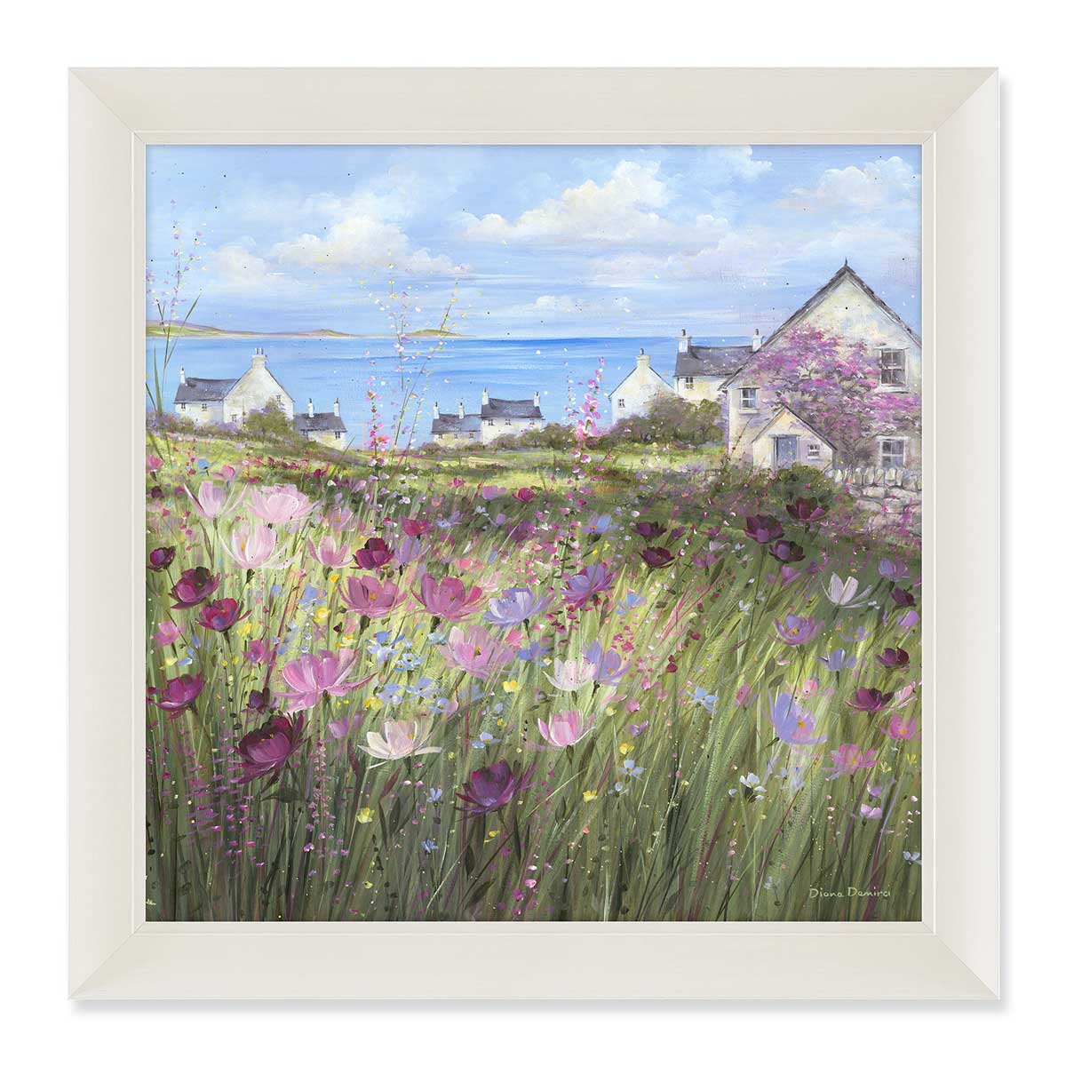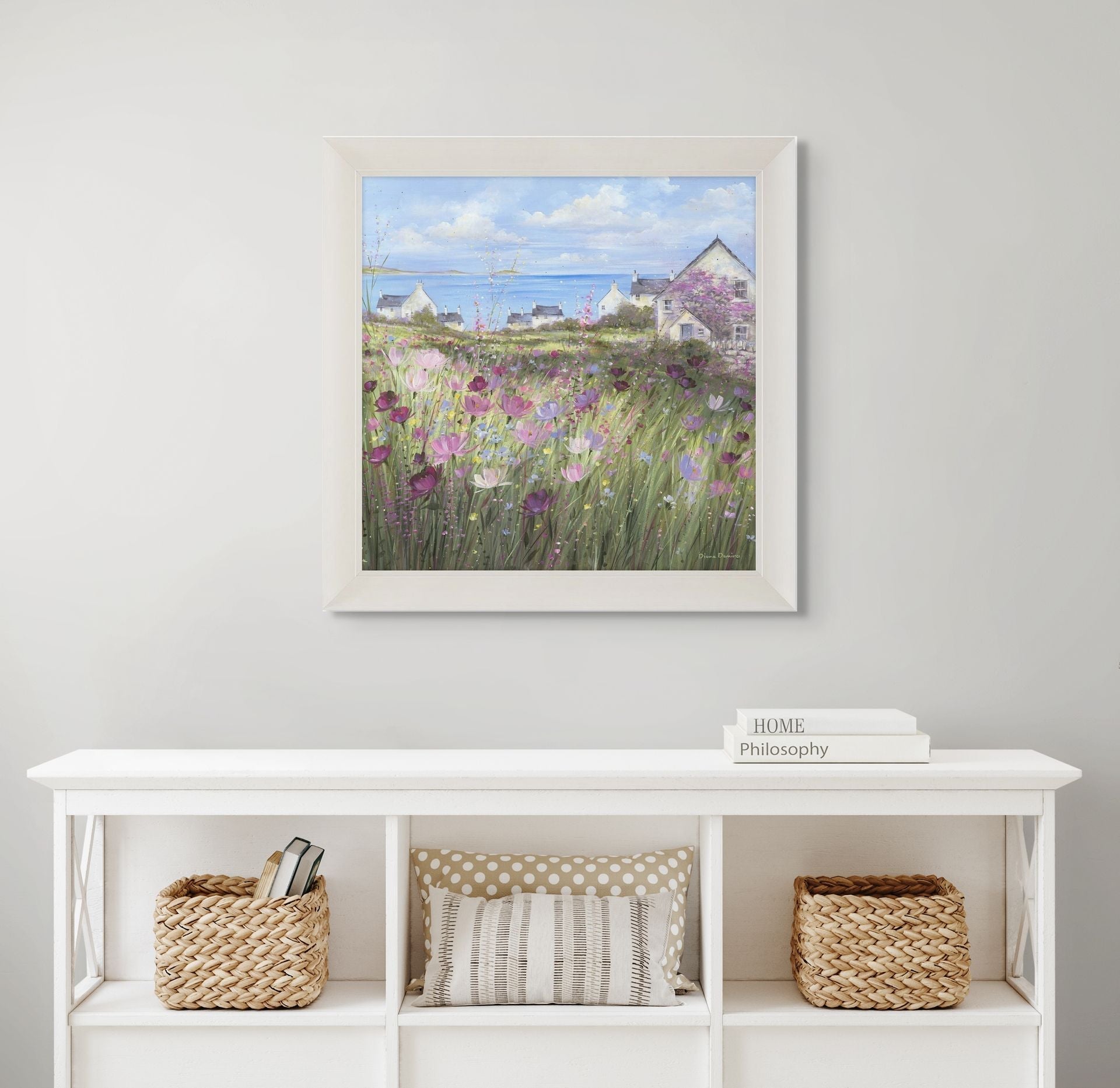 The 'Summer Afternoon' artwork captures a serene landscape, framed in a crisp white frame that enhances its contemporary appeal. Hand-finished with a textured gel, this piece offers a unique depth without the distraction of glass, allowing the vibrant colors and intricate details to take center stage. The scene features a lush field of wildflowers in shades of pink, purple, and white, set against a tranquil backdrop of coastal cottages and a serene blue sky. This artwork seamlessly combines quality craftsmanship with a refreshing design, making it a perfect addition to any living space. Its durable materials ensure longevity, while the easy-care finish allows for effortless maintenance, making it an ideal choice for both traditional and modern interiors.