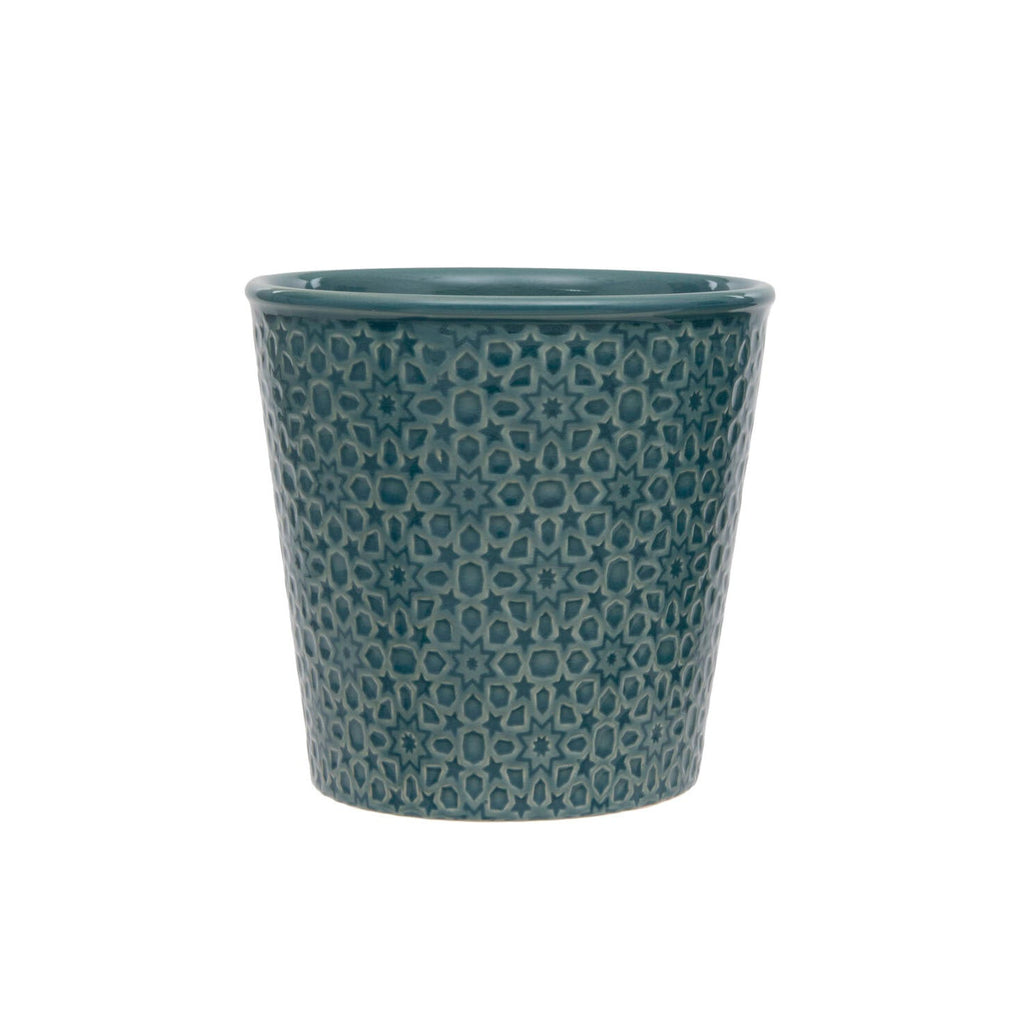 This teal ceramic pot with a delicate self embossed design is a lovely addition to any room. Large enough to hold a sizeable houseplant and pretty enough to hold a growing bulb, this plant pot is a great choice. Glazed inside to bear water and moisture so your surface is protected from your plant.