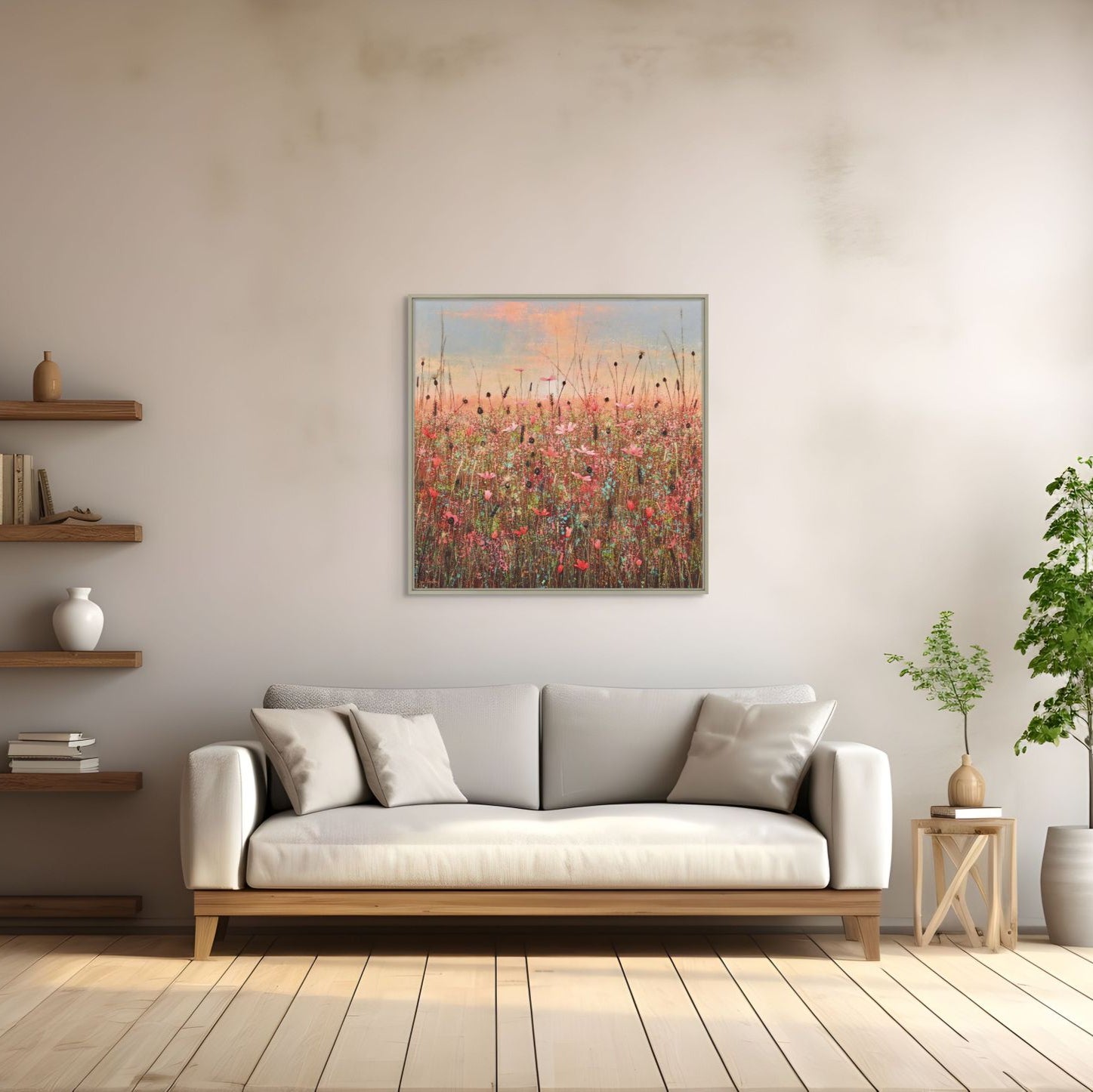 The End Of A Beautiful Day features a slim, sand-coloured frame that complements the vibrant artwork within. This framed piece showcases a breathtaking field of flowers, rendered in rich hues of pink, red, and green, set against a softly blended pastel sky. The use of high-quality materials ensures durability while exuding timeless craftsmanship. The colors are curated to evoke a sense of calm and tranquility, making it an ideal addition to contemporary living spaces. The frame's understated elegance enhances the overall aesthetic, allowing the artwork to shine as a focal point in any room. Perfect for those who appreciate quality and design, this piece invites a touch of nature into your home.