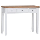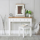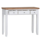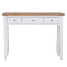 Our Thornham Dressing Table in White has three painted drawers all above four slender legs, with chrome metal knobs and an Oak top.