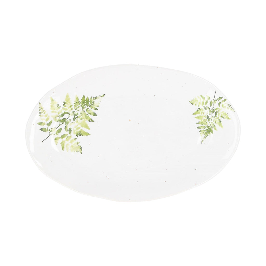 This white serving plate has a delicate green fern pattern on each end and a soft white background glaze. Wonderful as a serving platter for salads, breads or antipasti, inside or out!
