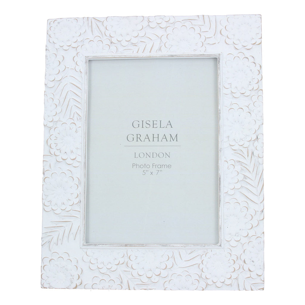 A white floral effect photo frame, with a wooden effect. Available in two sizes to suit either a 7 x 5" or 6 x 4" photo. Each white floral frame has a hand finished white floral effect design, so the precise finish may vary slightly.