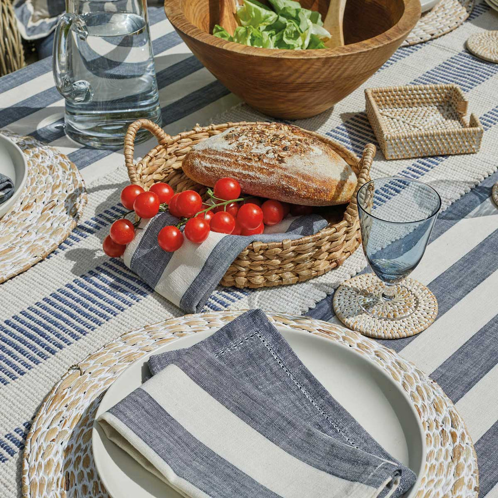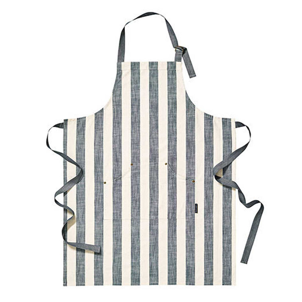 A wide flint blue striped apron in 100%. Generously sized with adjustable neck tie and long waist ties which can be crossed at the back and tied at the front. Large patch pockets, this is a very practical and stylish flint blue striped apron.