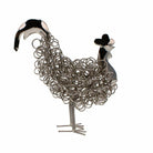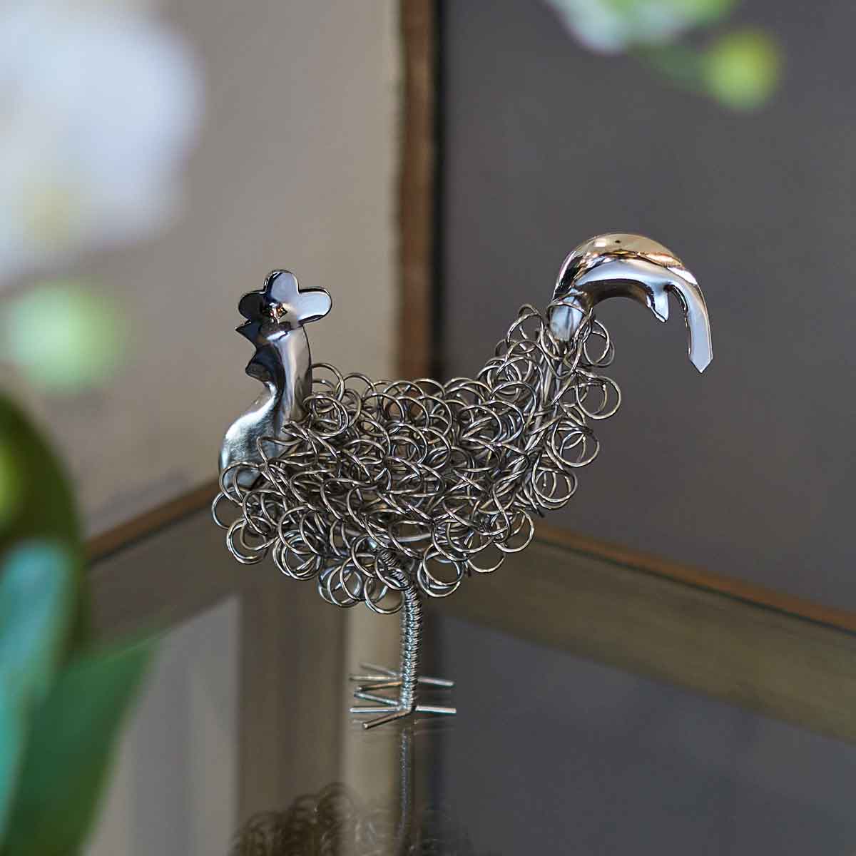 This rooster ornament is made from stretched and coiled wire, cross-wrapped around a frame and then nickel-plated.