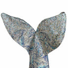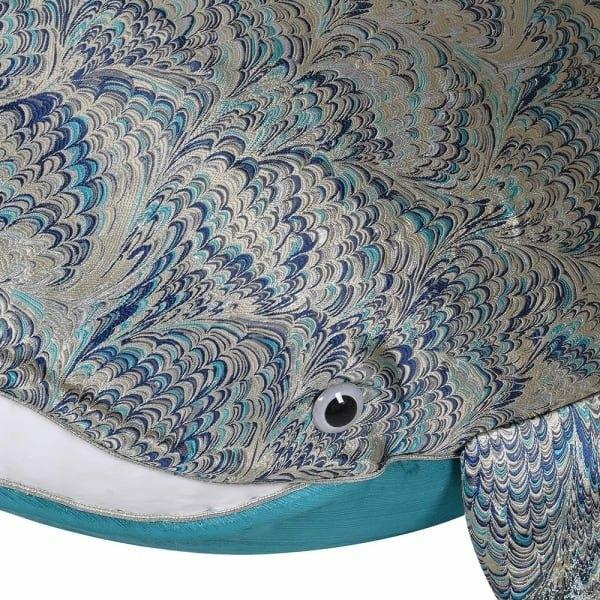Covered in Paisley-style fabric with a teal under-belly and sequins on his tail, Willy the Whale even has feathers to illustrate a water spurt.